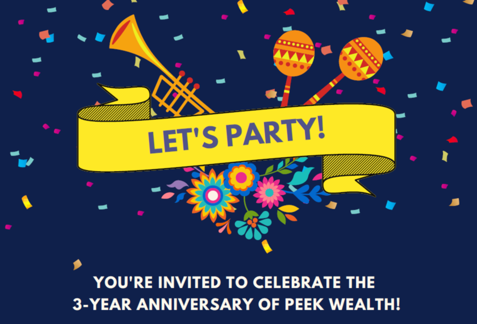 PEEK WEALTH is celebrating its 3-year anniversary, and we want to thank our clients for their ongoing support! Our anniversary fiesta will be open-house style with delicious tacos, refreshing margaritas, cervezas, a mariachi band, and more.